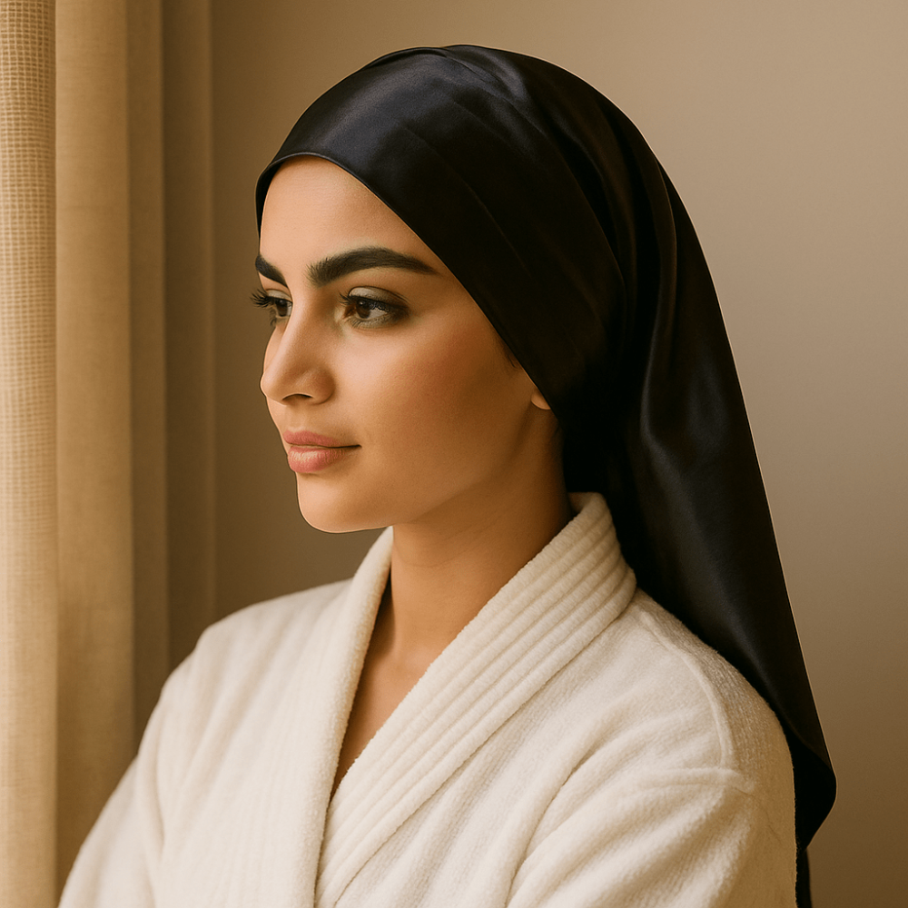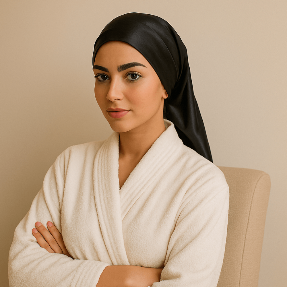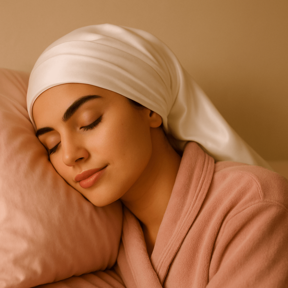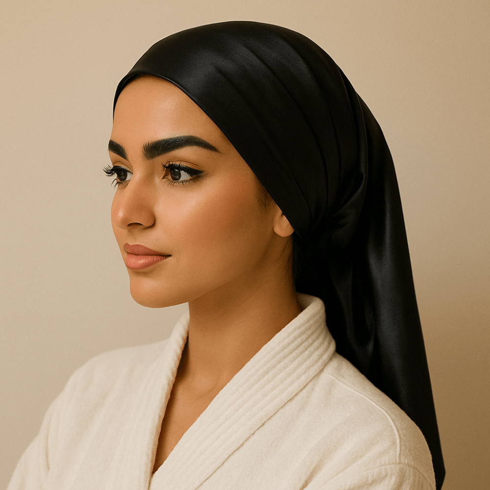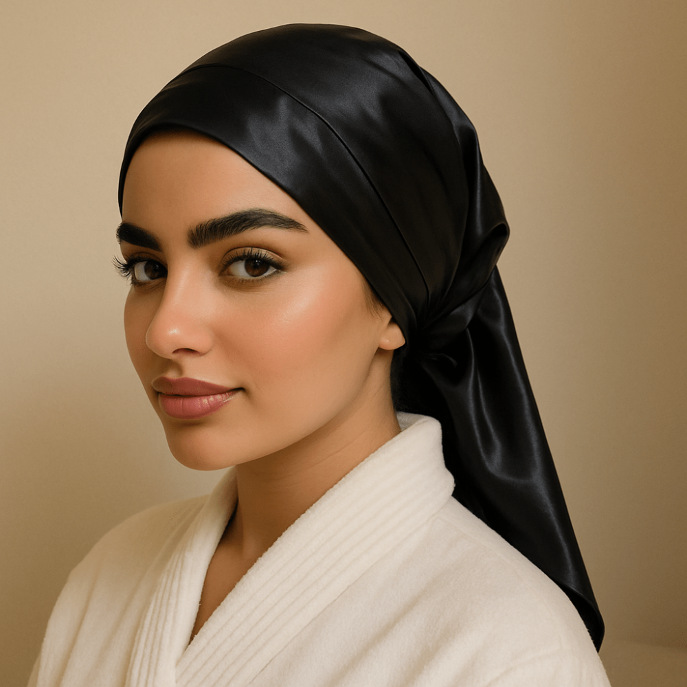 توربان حرير فاخر يحافظ على رطوبة شعرك، يقلل الهيشان، ويمنع التقصف أثناء النوم أو الاستخدام اليومي. مثالي للشعر الكيرلي والجاف.